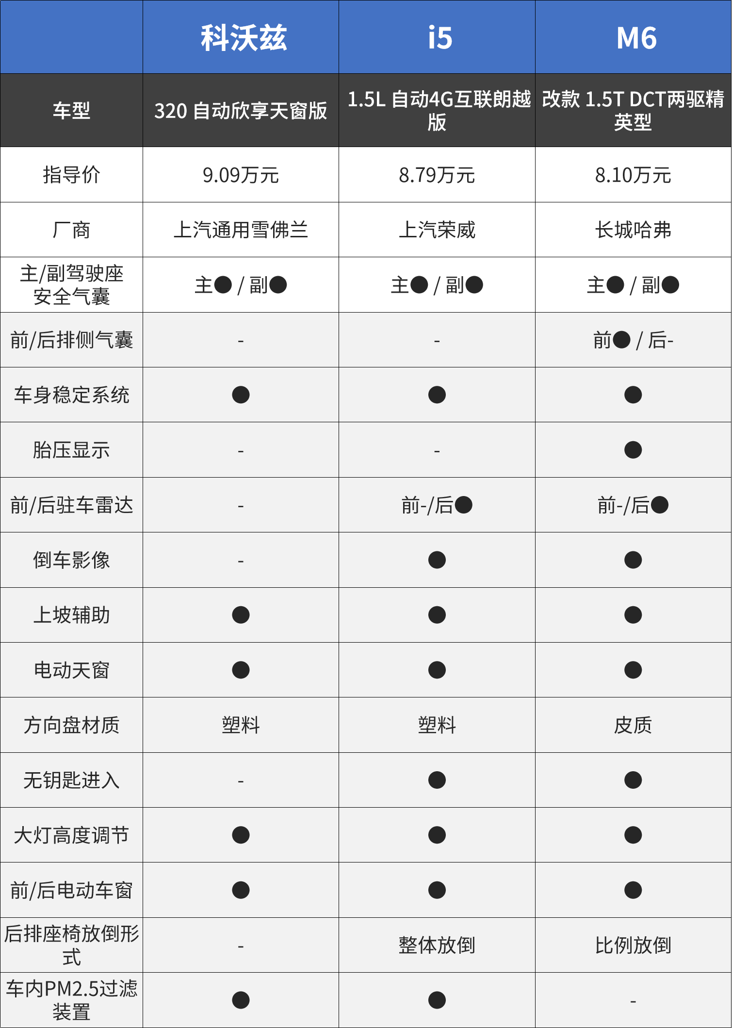 可以看到,荣威i5和哈弗M6的配置性更加丰富,具体体现在舒适性配置上,而科沃兹的基础性配置不会说太过寒碜。无疑,想要开得欢乐,就得加钱,但对于一些配置,就要考虑下是否真的符合自己的日常驾驶需求了。