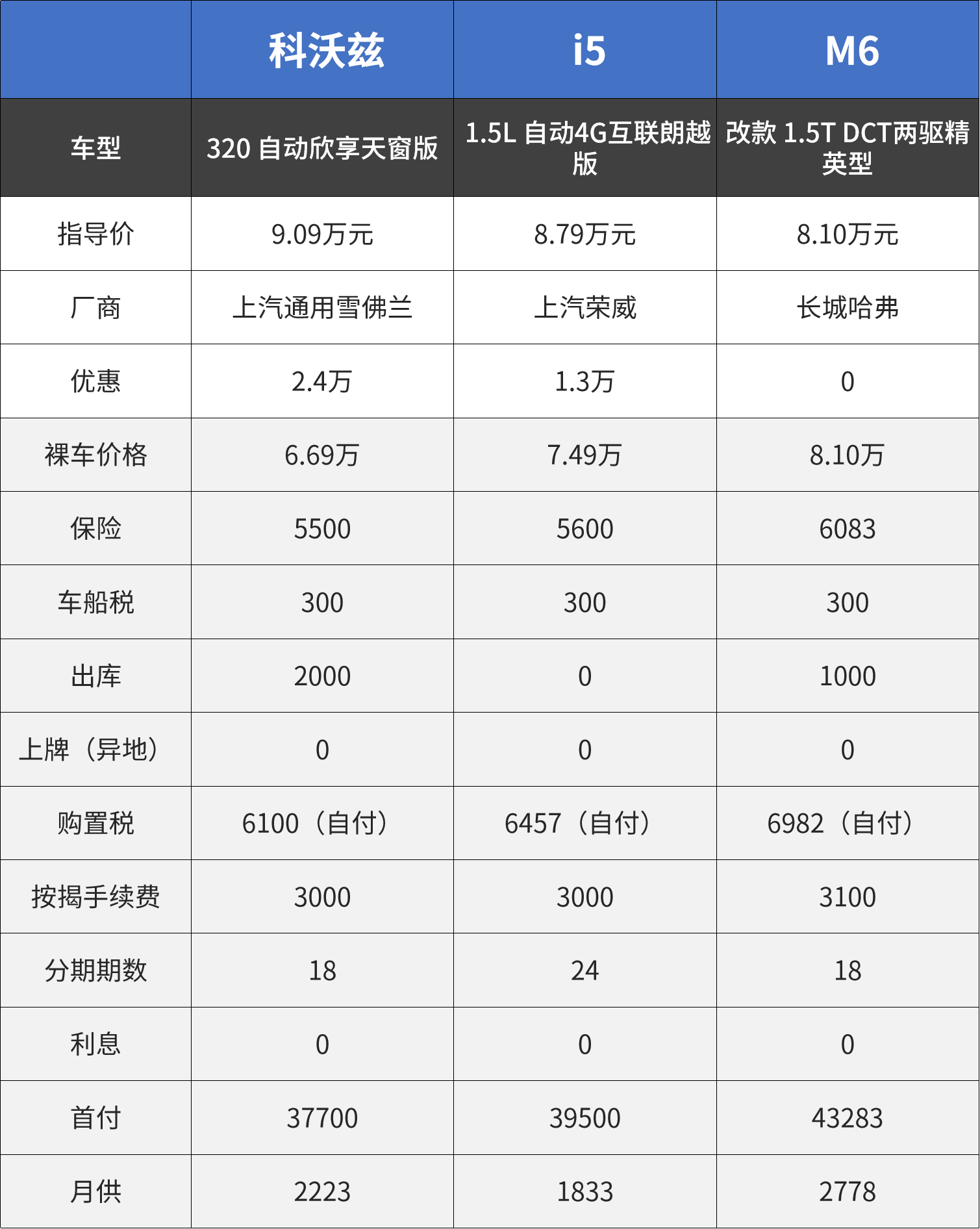 这三者价格都比较相近,并且在该价位上,合资与自主品牌的竞争异常激烈。整体来看,本期的主角还是比较钟意科沃兹比较多,好开是关键。经过家人商量,整体觉得合资品牌会好些。透过现象看本质,对于合资品牌的喜爱,也是目前一些消费群体的普遍意识了。哈弗M6虽然价格比较实在,很多配置都有,但是作为消费者而言,这些真的是自己不可或缺的配置吗?对于荣威i5,整体表现会比较均衡些,但奈何对不上眼。同样作为自动挡的入门配置,整体的落地费用,不占据优势。而对于科沃兹,加点钱,选择9.99万那款版本也是不错的。多的一些配置,更符合他的日常驾驶需求。比如9.99万的320自动欣悦版,后刹车类型已经升级为盘式刹车盘,安全性得到提高。