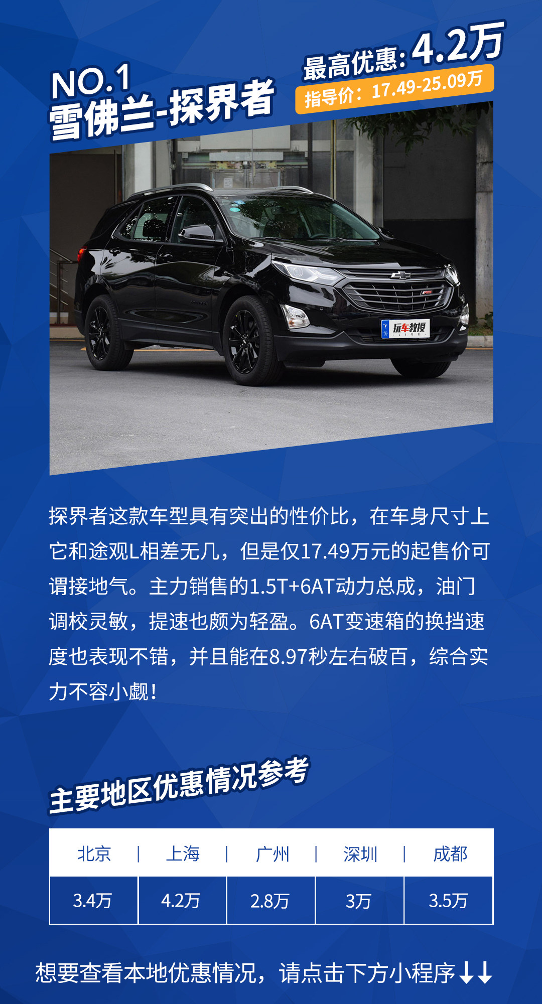 今天提到的多款车型在优惠过后的性价比都比较出众!尤其是斯柯达速派拥有着类似迈腾的机械性能,但价格真的不高!而探界者在行驶品质和空间上都表现比较给力,值得我们多多关注!