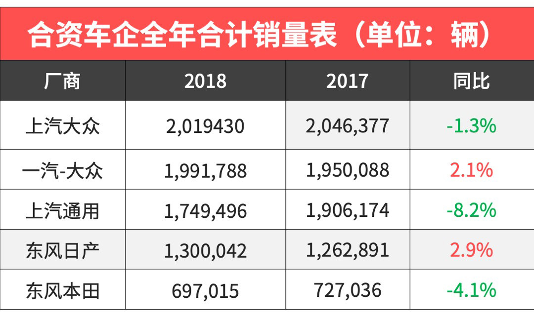 一汽-大众2018年12月销量为187,451辆,同比下降11.7%,位居第二;全年(2018)累计销量1,991,788辆,同比上升2.1%。在这样的大环境下,多家车企全年表现均出现不同程度同比下滑现象,而一汽-大众仍能保持稳定增长也得益于产品布局完善的体系实力。