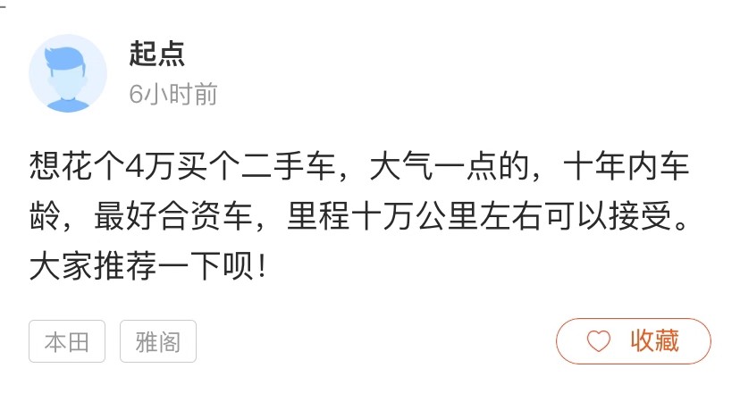 教授有个同事之前1万不到买了辆北斗星,经过(合法)爆改之后车子十分的拉风,你可以到“玩车TV”看看。4万左右的二手合资,首推日系的卡罗拉和雅阁,口碑好质量好,再战几年不是问题。另外像大众捷达、朗逸这些都可以,老款的伊兰特质量也挺不错的,也可以考虑一下。不过具体还是要看车子,最怕还是买到事故车、涉水车,所以买之前最好找个老司机把把关。