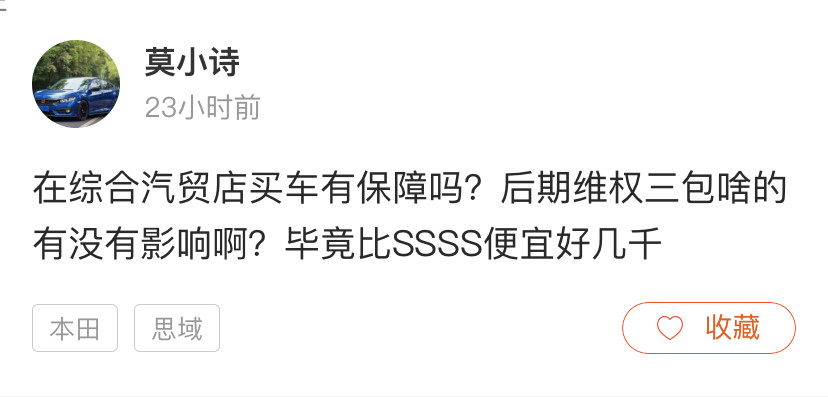 一般大家买车都是去汽贸店或者4S店。汽贸店最大优势在于车子售价相对较低,相比之下4S店车子只能从厂家拿货所以价格较高,不过好在售后服务较为完善。三包的话不需要担心,两者同样都提供,出问题就找店家就是了。不过教授更加推荐4S店,毕竟4S店服务规范,车型来源也比较有保障,后续维修保养也可以继续选择该店,汽贸店则不具备后期保养的这些。至于选择哪个方式购买,看个人的意愿吧。