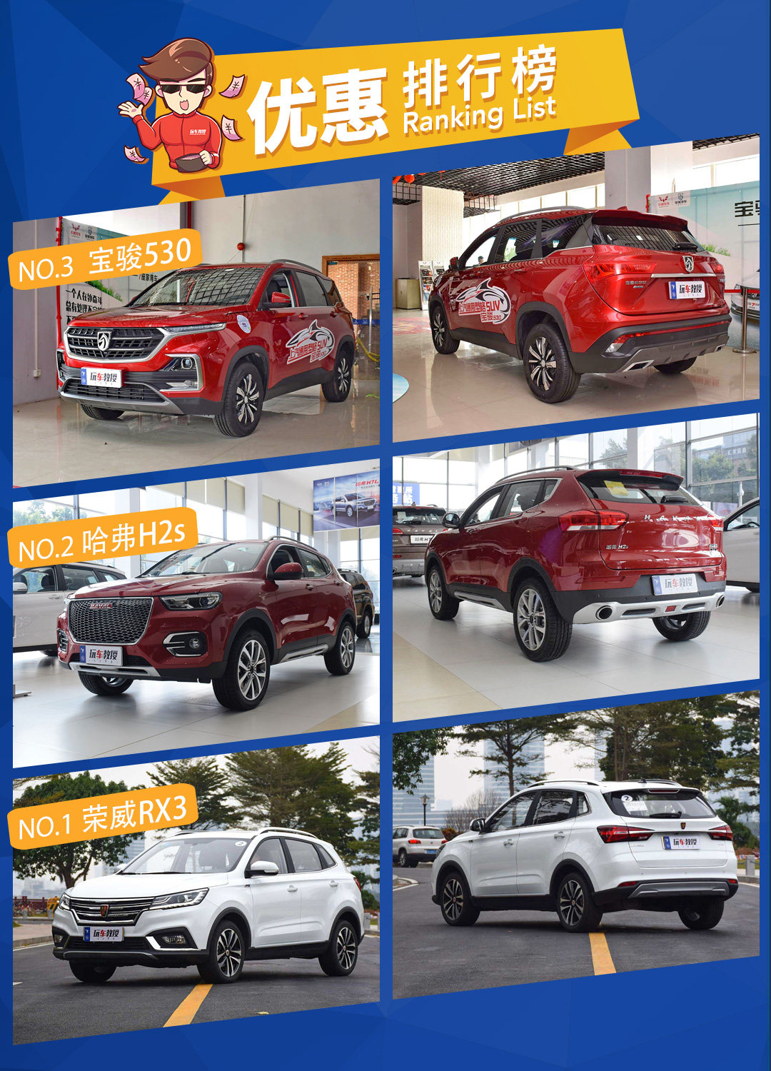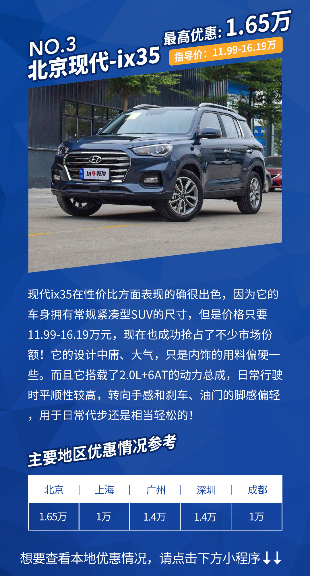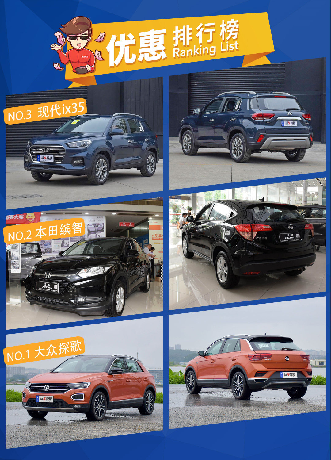通过今天的优惠调查,我们可以看见大众探歌、现代ix35、本田缤智、荣威RX3、哈弗H2s等多款车型都给出了不错的优惠幅度,这些车型在优惠后的性价比表现不错,其中荣威RX3、现代ix35这两款车型原来定价已经较低,在优惠过后竞争力再进一步,值得以家用为主的消费者关注!