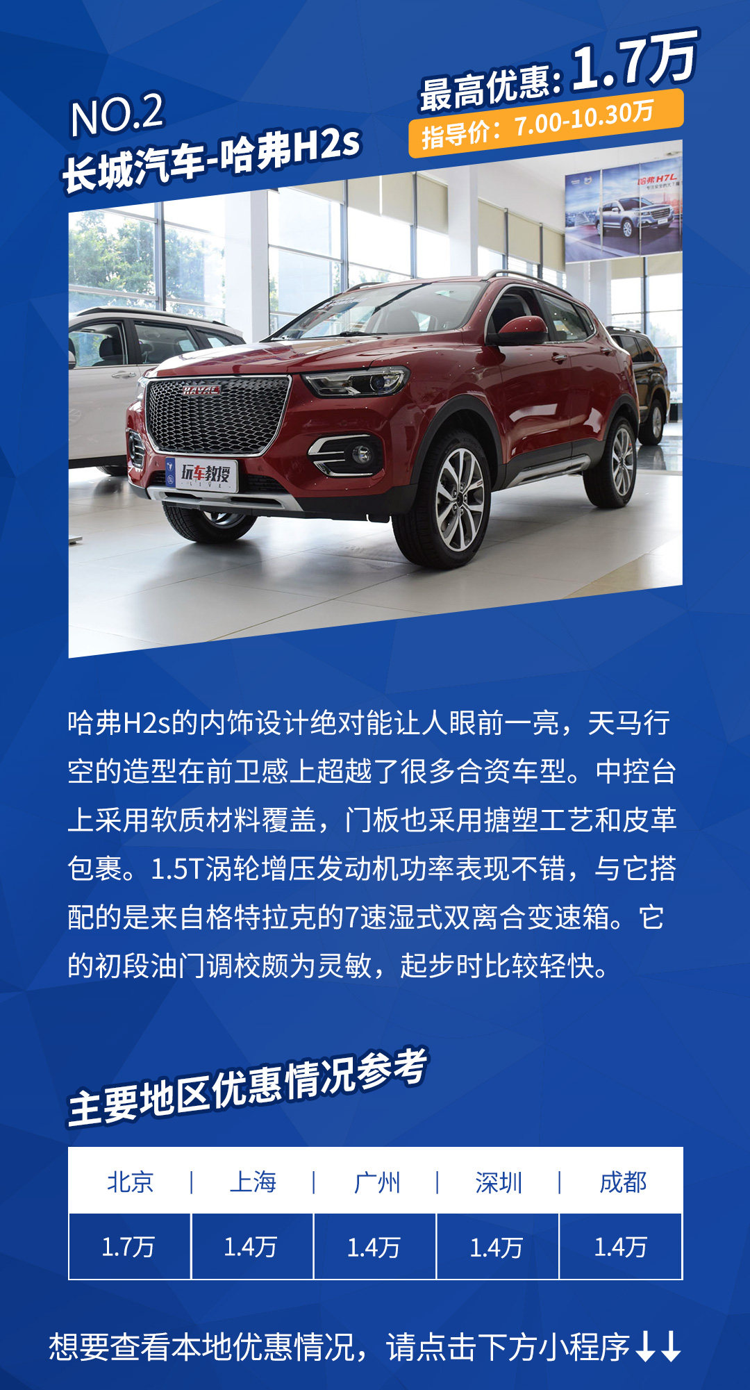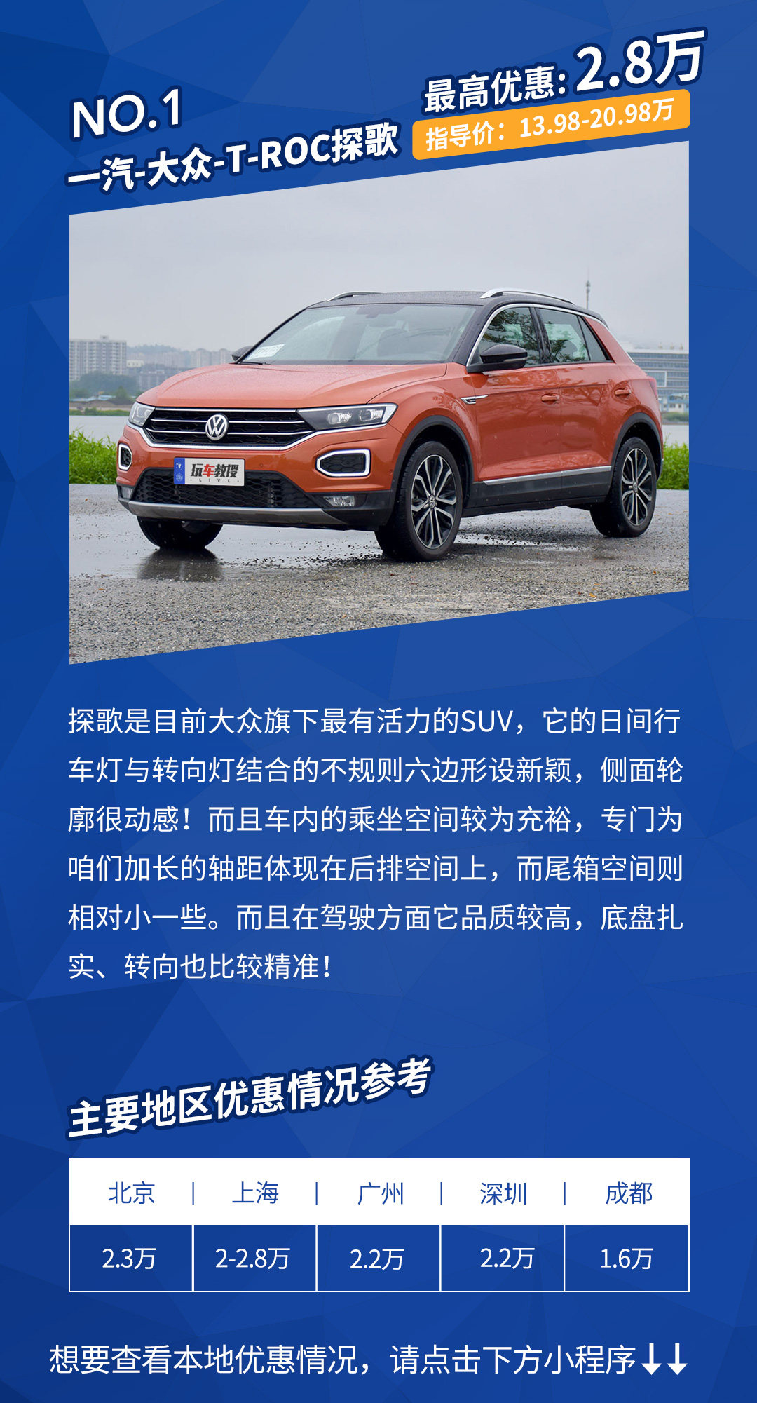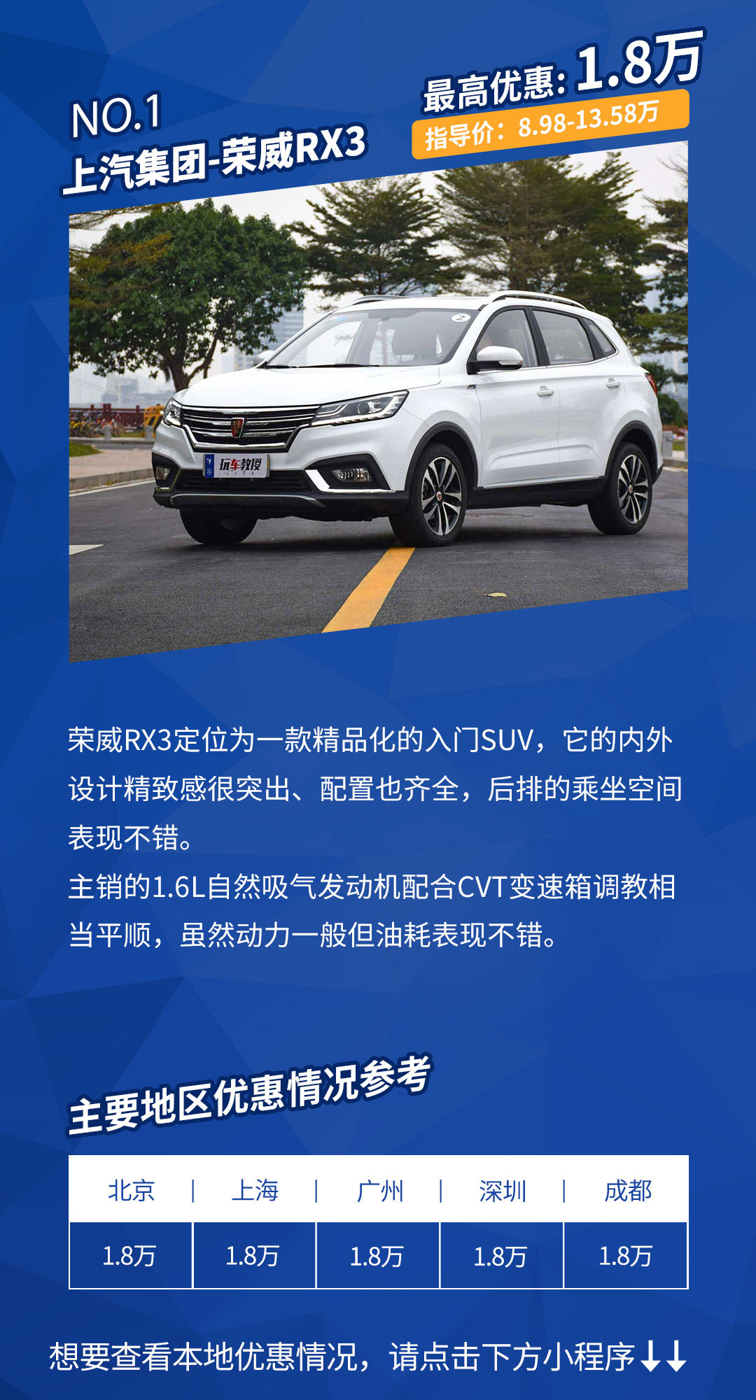 通过今天的优惠调查,我们可以看见大众探歌、现代ix35、本田缤智、荣威RX3、哈弗H2s等多款车型都给出了不错的优惠幅度,这些车型在优惠后的性价比表现不错,其中荣威RX3、现代ix35这两款车型原来定价已经较低,在优惠过后竞争力再进一步,值得以家用为主的消费者关注!