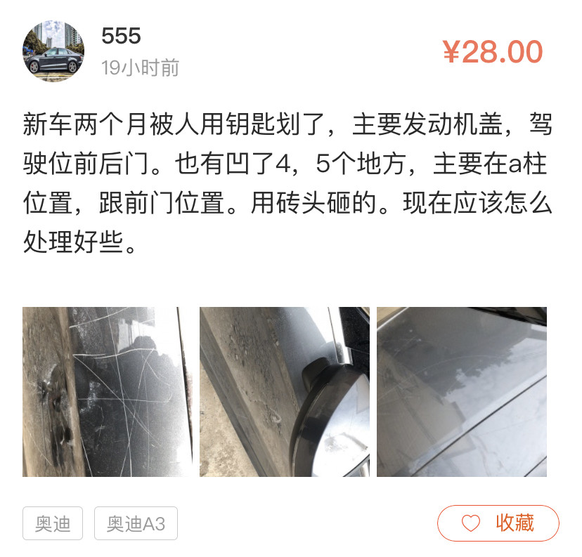 感谢热心网友@千万种野心的回答。能够找到当事人最好了,不能找到只能自己掏钱或者报保险了。车主可以到当地4S店做局部钣金喷漆,采用原厂漆的色号色母去调制,这样色差相对较少,还原度也较高;如果不是凹坑不是特别严重,车主也可以对有坑的地方做凹陷修复,漆面已经划的露出底漆了,抛光处理后看上去会好看一些(PS还有会有痕迹),如果没有强迫症和处于对车辆保值率,建议第二种方法。至于选择修理厂还是4S店看个人,只要是技术过硬细心的师傅都可以,不过4S店总体会更好一些。