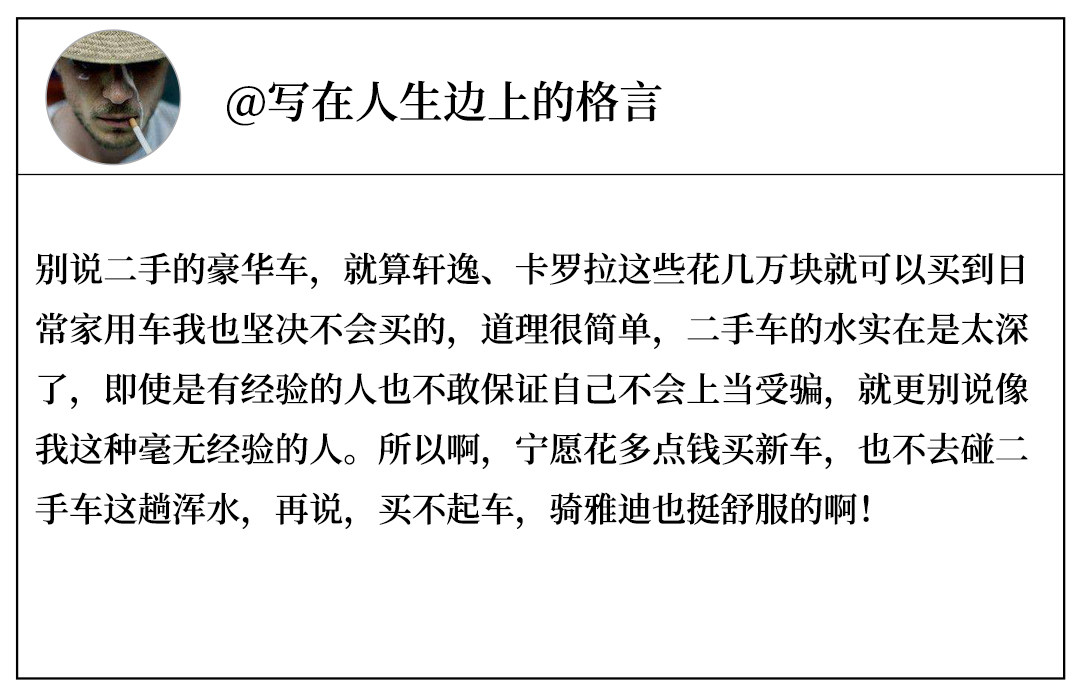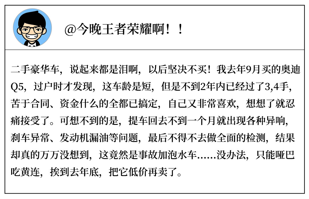 二手豪华车到底值不值得买,其实是个比较主观的问题,但正像文中所说的,现在二手车市场参差不齐的,泡水车、翻新车、事故车各种车都有,陷阱重重,要想真的买辆可靠,能令自己满意的二手豪华车确实不容易。所以如非真的是必要,或者说真的是遇到了性价比、车况以及其他各方面的表现都很不错的这种千载难逢的二手豪华车,个人不建议作为消费者的您去趟这浑水。
