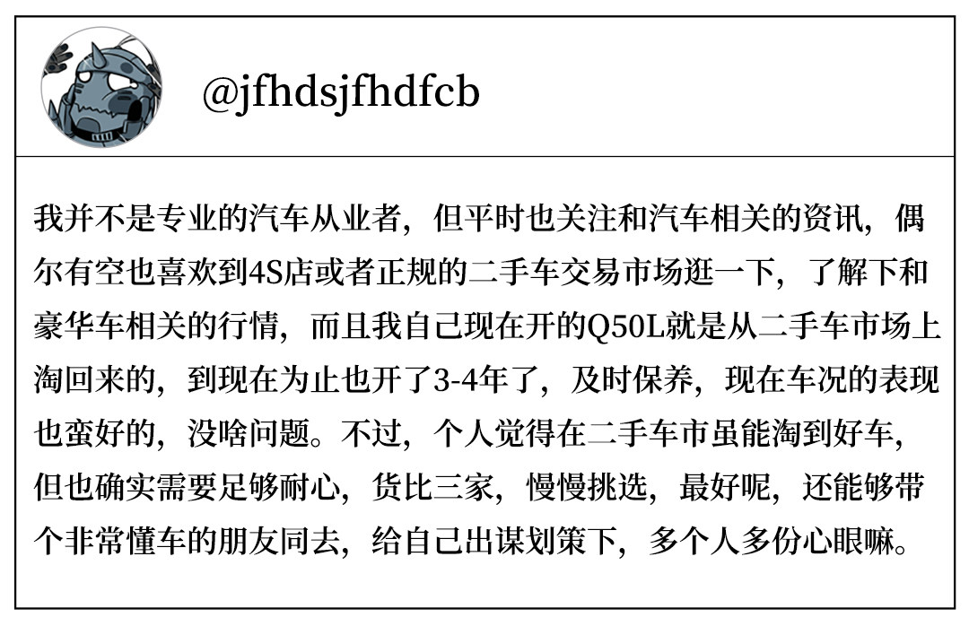 但是二手豪华车真的值得花钱去拥有吗?显然这是个非常有争议性的话题,至于其中缘由嘛,非常的简单,人不同看法自然也会有所不同。而针对这个话题,教授也搜集了些网友们对此的看法与评论: