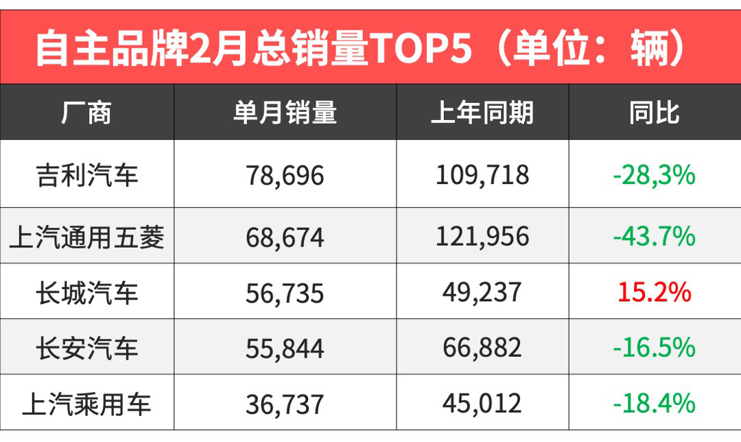 受春节长假和工作日较少的因素影响,2月的销量历来都是全年最差的,再加上今年的经济依然不好,各个车企均出现大幅度下滑,其中自主品牌也不能幸免。那么2月份的自主品牌厂商销量前五有哪些,以及这种下滑是否会继续下去,那么就请阁下跟教授一起继续往下看。