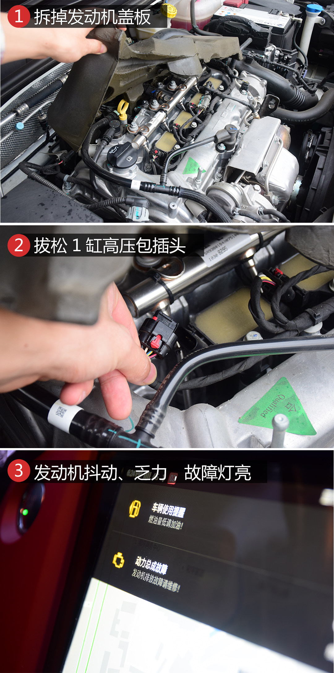 教授打开发动机盖,拆掉发动机顶部的护板之后拔松了1缸的高压包插头,拔松插头之后发动机1缸会出现缺火的情况,由于1缸无法点火,一台四缸发动机就变成了现在的只剩3个气缸的状态,发动机会严重抖动、乏力且亮起故障灯,由于喷进1缸的汽油无法燃烧,会随着排气一起进入催化器然后通过排气管排出,所以尾气也会带有严重的异味,这样的故障够不够吓人?
