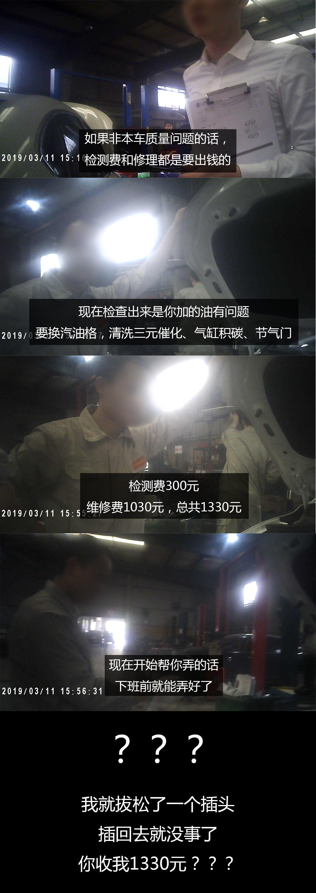 加的汽油有问题导致燃烧不好,出现不同气缸缺火的情况,现在三元催化器、节气门、气缸都需要清洗,汽油格要更换!因为是加的汽油有问题,所以要掏300元检测费+各种清洗的材料费和工时费等1030元,共计1330元!(教授掏了300元检测费,表示还有事暂时不修了,1030元的各种换件清洗服务没有做)