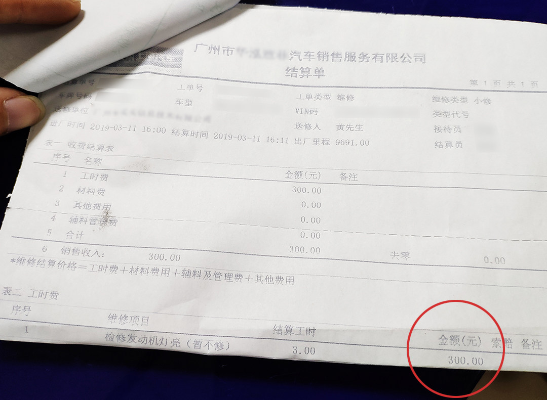 在4S店检查开始前4S售后服务顾问就提前声明,车辆虽然在保修期内但是如果是人为因素导致故障的话需要出300元的检测费,这里就让人感觉有猫腻了。一小时的检查后售后服务顾问告知车辆检查完毕