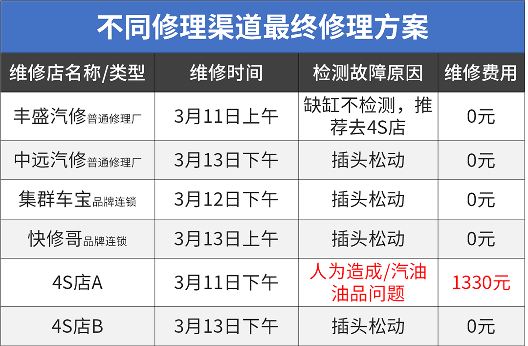 我们在快靠近修理厂时停车拔掉1缸高压包插头,然后去4S店/品牌连锁修理店/普通修理厂三种修车渠道共6家店(每一类暗访2家店),看松掉一个插头的事,这6家店分别会给出怎么样的维修方案呢?