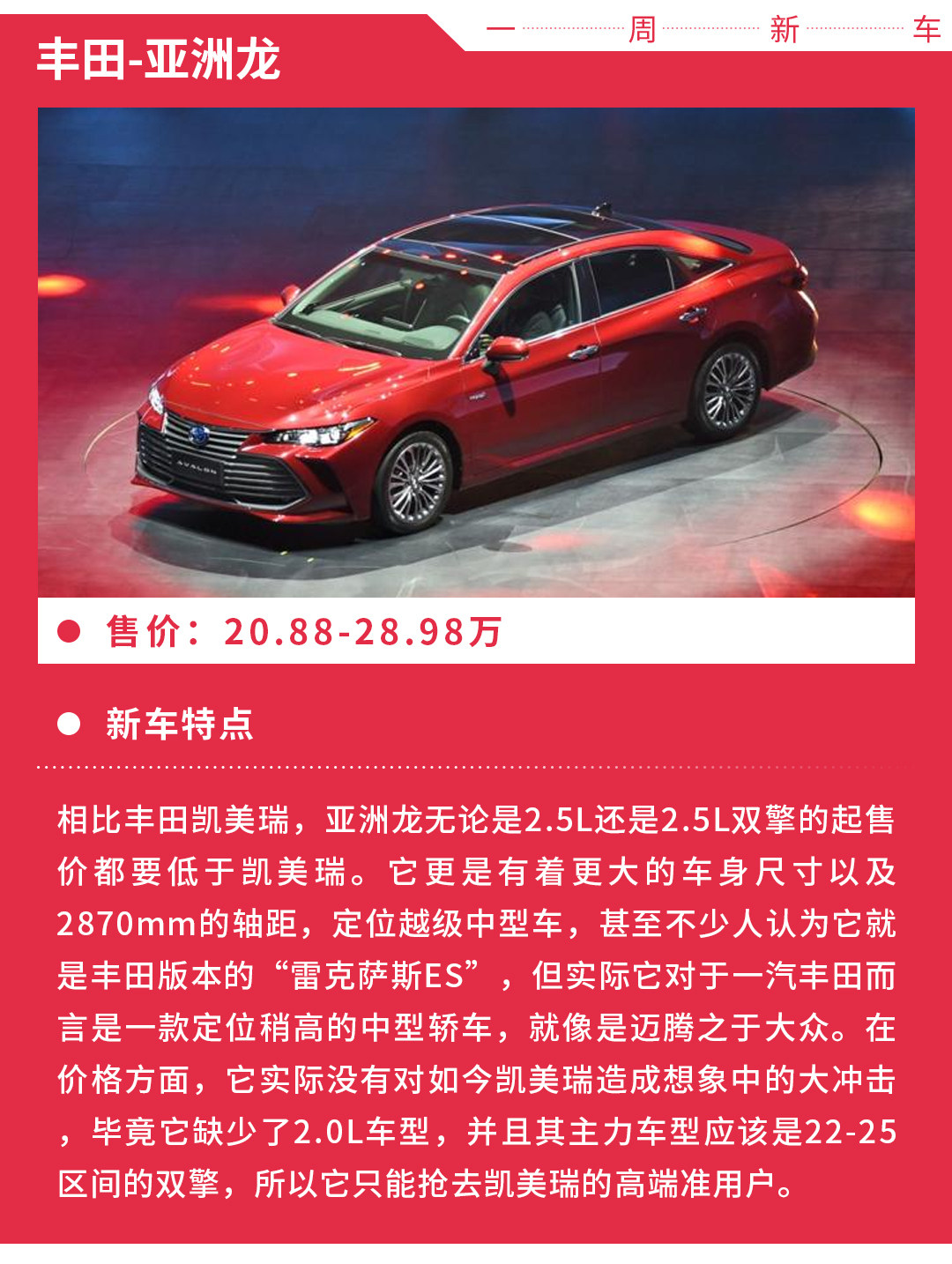 但在今天,你会发现同品牌之间的内斗,一汽丰田居然对凯美瑞来了一次猛击?比它大还要更便宜?话不多说,马上进入《一周新车》。