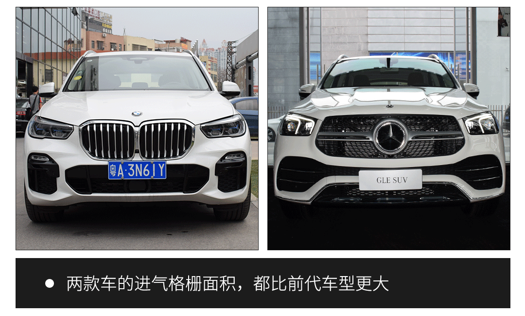 从正脸看,两款车的造型相比前代都发生了很显著的变化,最明显的便是中网,X5上两个宝马家族标志性的双肾式进气格栅比前代更大,而大灯也不再采用与中网连为一体的开眼角设计;GLE的一体式中网的面积和三叉星车标的尺寸也比前代更大,且车灯也采用全新的近似三角形的造型。
