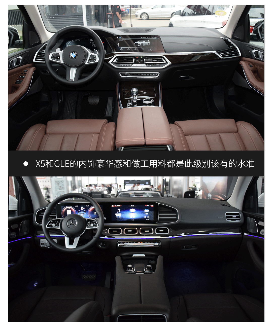 两款车的内饰同样是翻天覆地的变化,无论是科技感、豪华感,还是做工用料,乍一看都达到了这个级别的豪华SUV该有的水准,而GLE的两块超大屏幕,更是让很多消费者为之着迷,但如果从细节上一个个推敲,则是二者之间互有胜负。