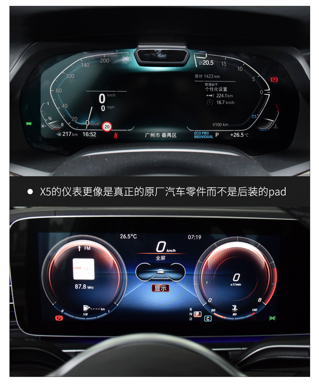 首先就是仪表和中控屏,两款车都是全液晶屏幕,X5虽延续了前代的仪表和中控屏分体式设计,但仪表指针采用不规则形状,耐看之余又让人耳目一新;而GLE虽是连通式大屏,可仪表指针却是与机械仪表一样的双圆设计,立体感和新意都不如X5,唯一的优势就是大。