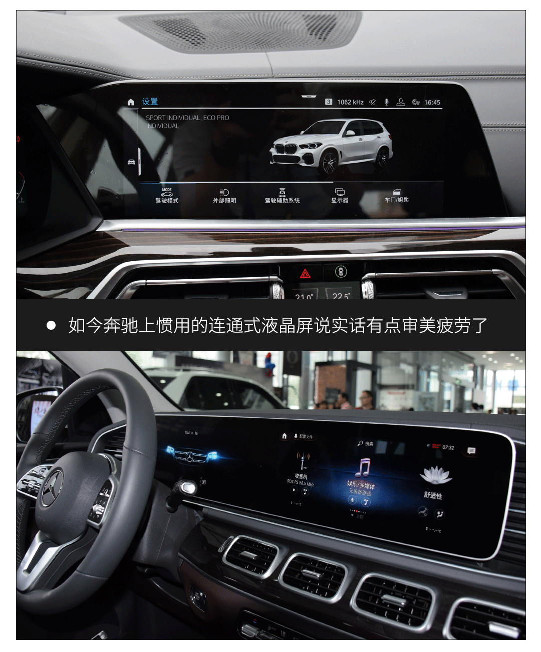 X5的仪表和中控屏更像是汽车上的零件,而GLE就像把超大的pad装到车上一样。或许教授不得不承认,奔驰GLE的内饰在主观感受上的豪华感和科技感更强,可能更受普罗大众欢迎,但本人确实对这套大连屏式的设计有点审美疲劳了。