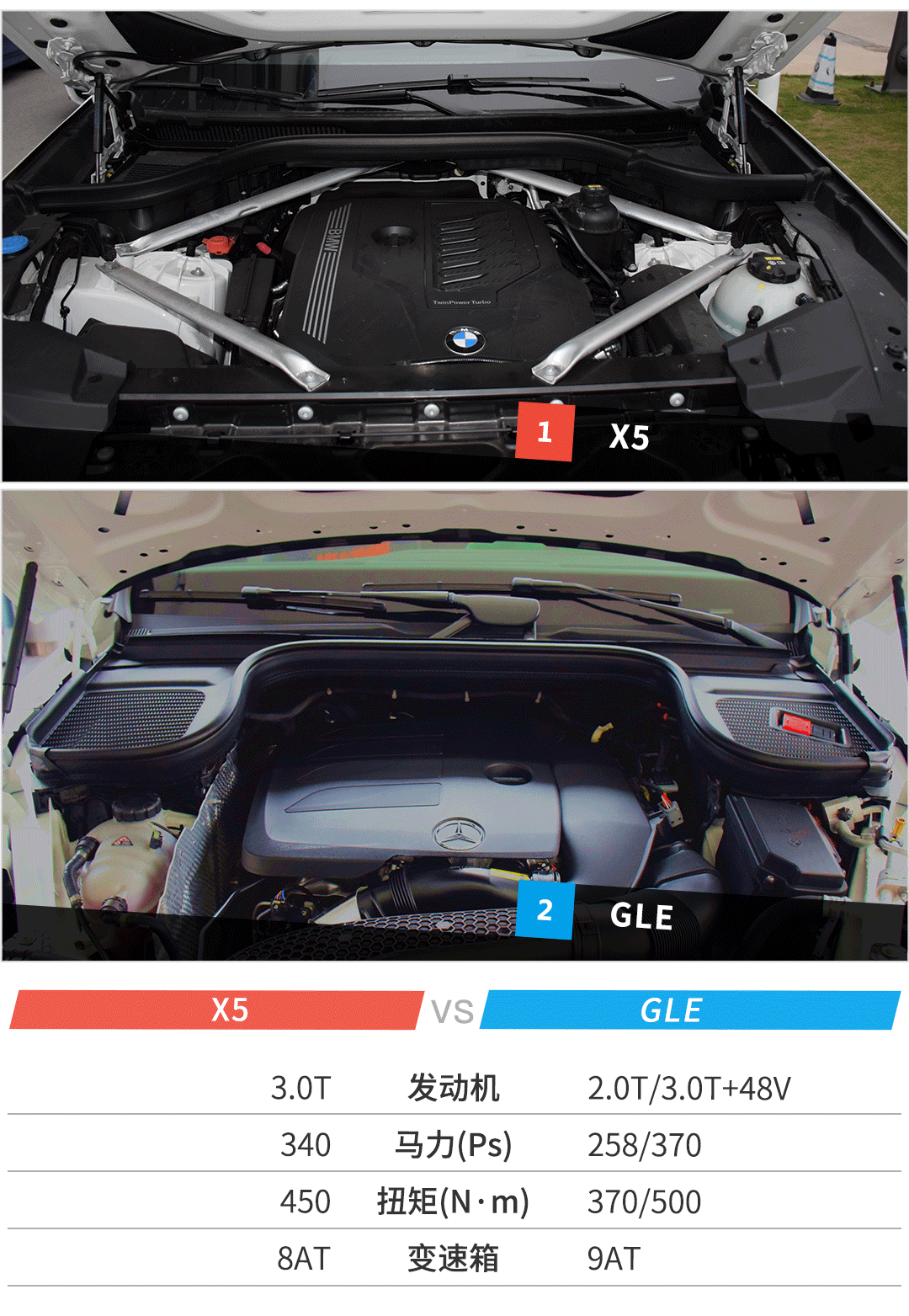 目前中规X5仅有3.0T直列六缸车型,尚无2.0T四缸和4.4T V8车型;而本次实拍的GLE则是2.0T高功率四缸引擎的动力总成,海外版的3.0T直六引擎+48V微混车型相信以后也会引进。(下表中GLE动力参数为海外数据,中规版动力参数尚未公布)