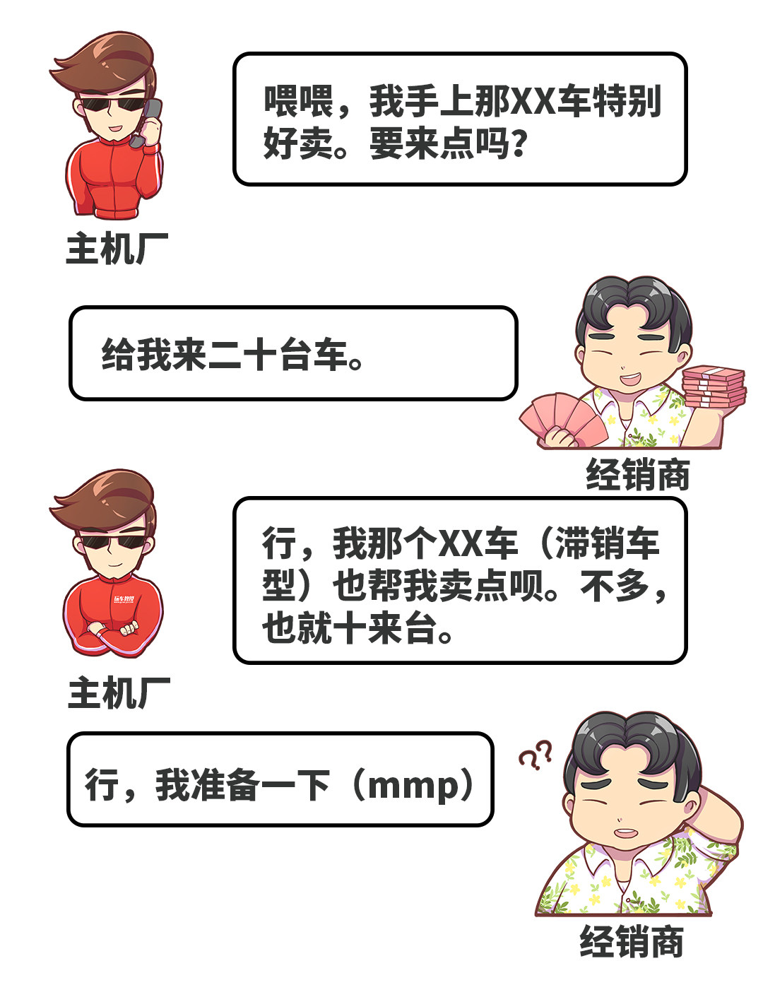 如果碰上市道好或者厂商出了一台竞争力超强的车型,这时候厂商腰杆就挺得特别直。厂商会仗着手上有一台热门车型,会搭售一些冷门车型给经销商,否则经销商就拿不到或者少拿热销车型。