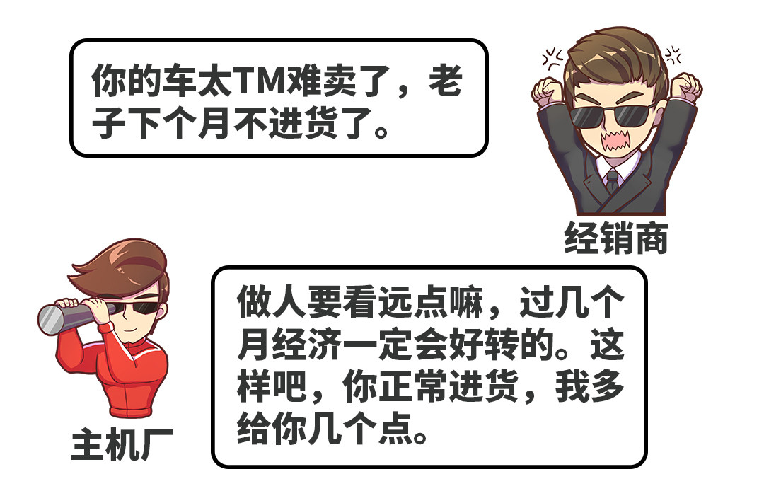 要是碰到市道不好,车子卖不出去。这时候就轮到经销商说话底气足了。“你们的车卖不掉,别再压库了。”“你再不改改你们的商务政策我们就集体停止进车。”