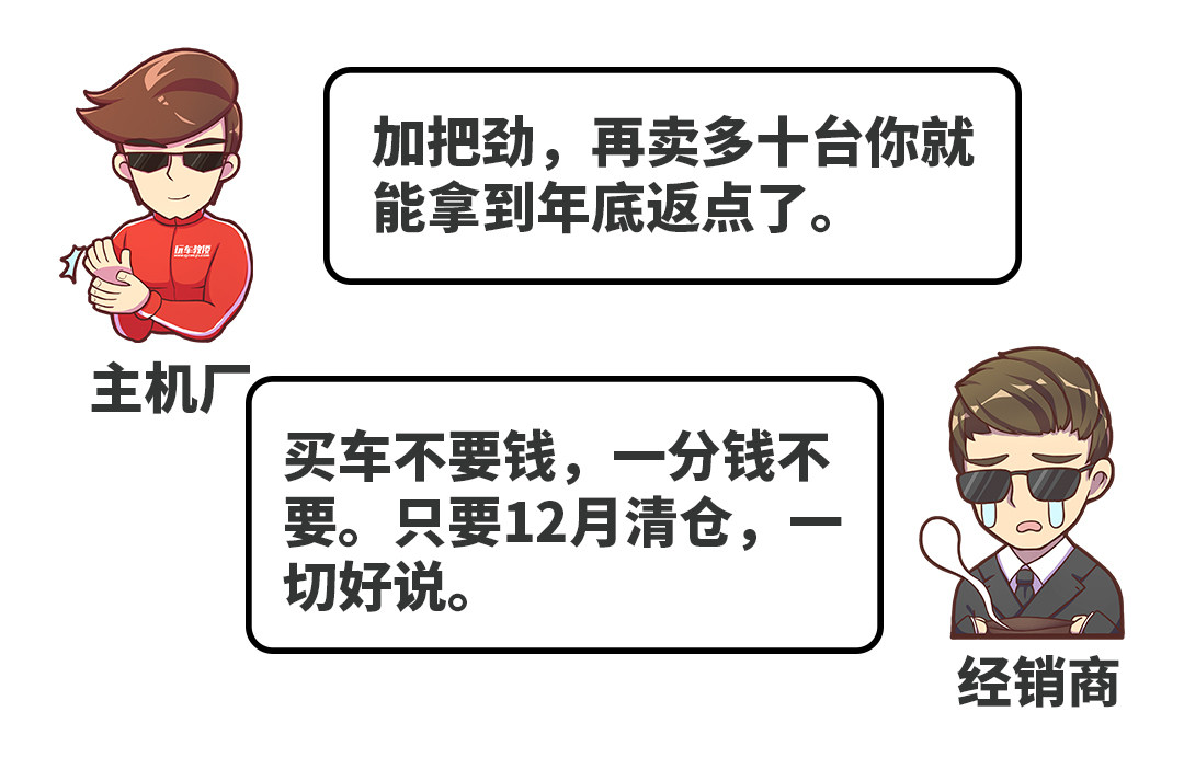 当然车厂不会无脑压货,如果经销商反馈某款车卖不好,那么车厂就会在下一个时期减少产量。而车厂有时为了让经销商多卖车,还会有一个叫作返点的制度在。如果在年底经销商达成目标,即可获得额外的奖金。很多时候经销商的12月份大促就是奔着返点去的。