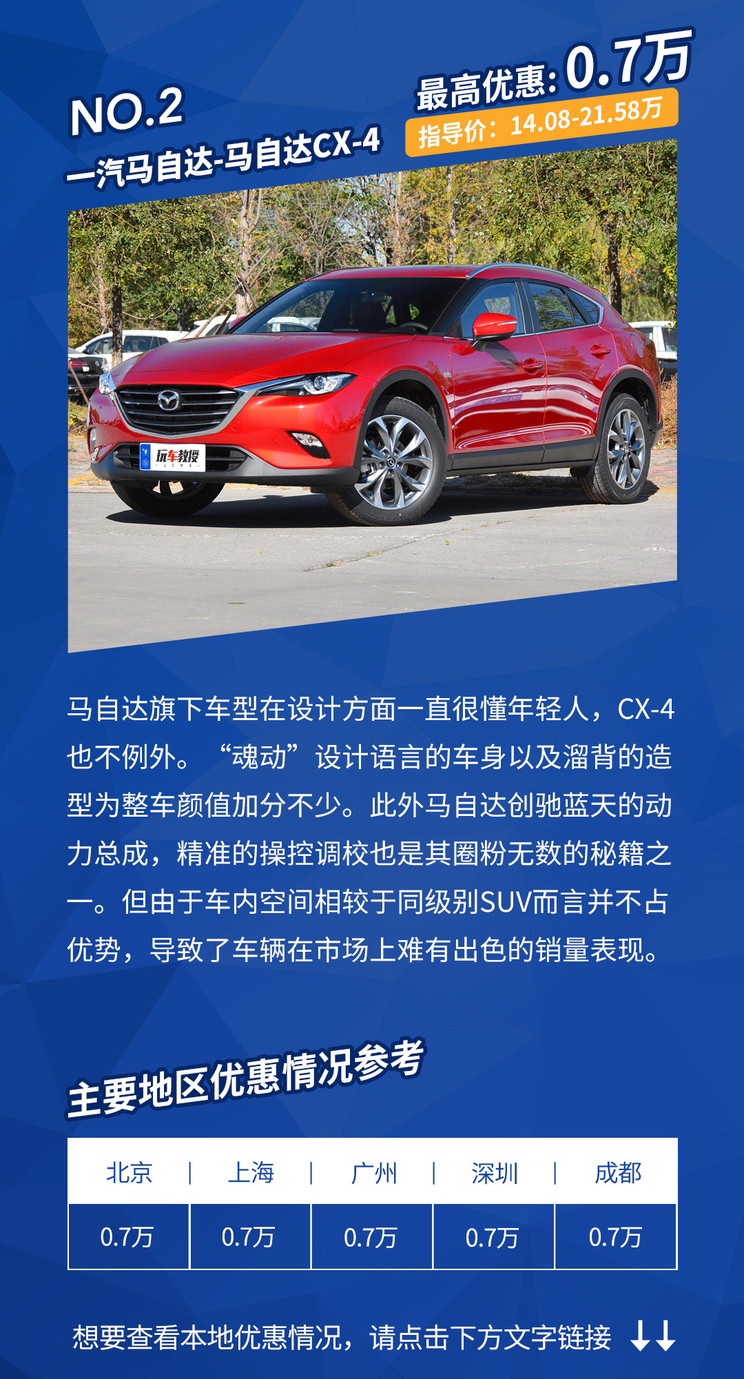 优惠详情:北京、上海、广州、深圳、成都地区的大部分4S店均为现金优惠。