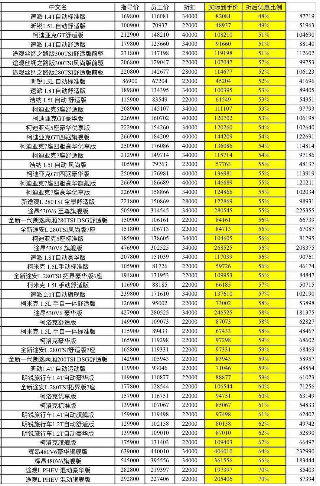 从网上爆料的图片来看,这次促销的是上汽大众,打折幅度从48折到7折,8.2万买1.4T速派,14.6万买柯迪亚克7座旗舰版,12.2万买1.4T途观L。看到这价格,教授再挑剔也挑不出这些车有毛病。