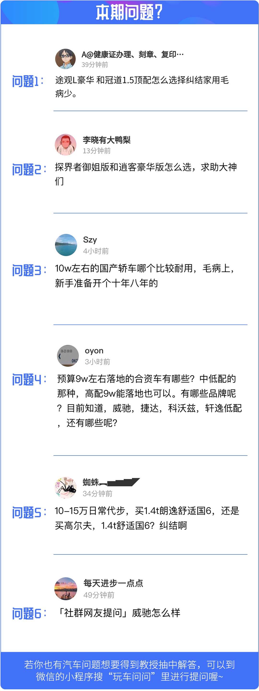 在网友问答栏目中教授将会在小程序-玩车问问里挑选5个问题进行回复,如果对购车、用车有什么疑问的话,欢迎点击下方玩车问问小程序,有许许多多非常厉害的技师为你解答喔!