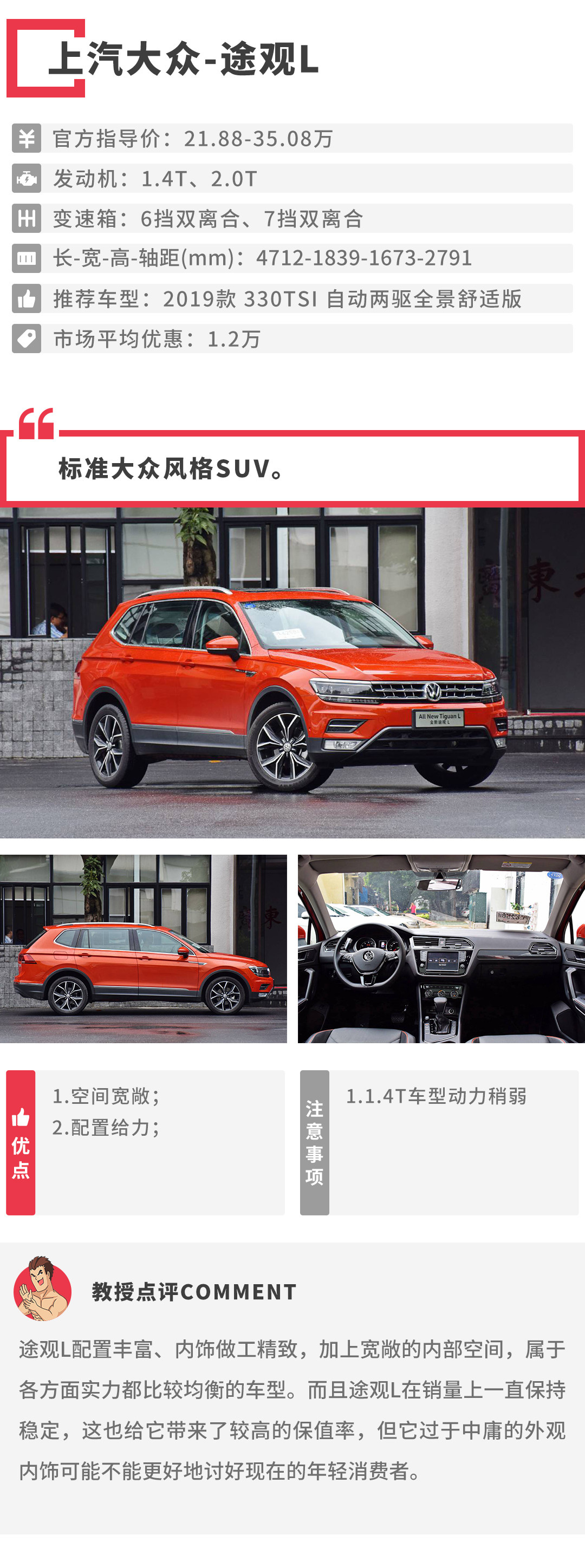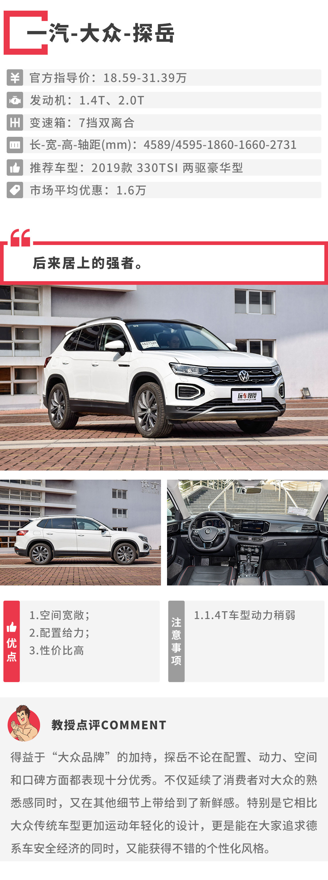文中的5款SUV都能体现出一款SUV该有的颜值高、空间大和经济性,但总的来说,如果考虑颜值、安全性、经济性等全方面综合的话,教授更加推荐一汽-大众探岳,因为说到的这些,它都能做到了。