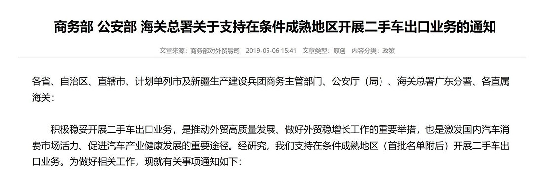 今年4月底,商务部、公安部、海关总署三部门联合下发《关于支持在条件成熟地区开展二手车出口业务的通知》,从国家政策层面鼓励二手车出口业务。广州率先完成了9辆总货值110万元的二手车出口业务,据悉这9辆二手车只是出口的300辆车的一部分,这批二手车的总价值将达到250万美元(约1720万人民币)。