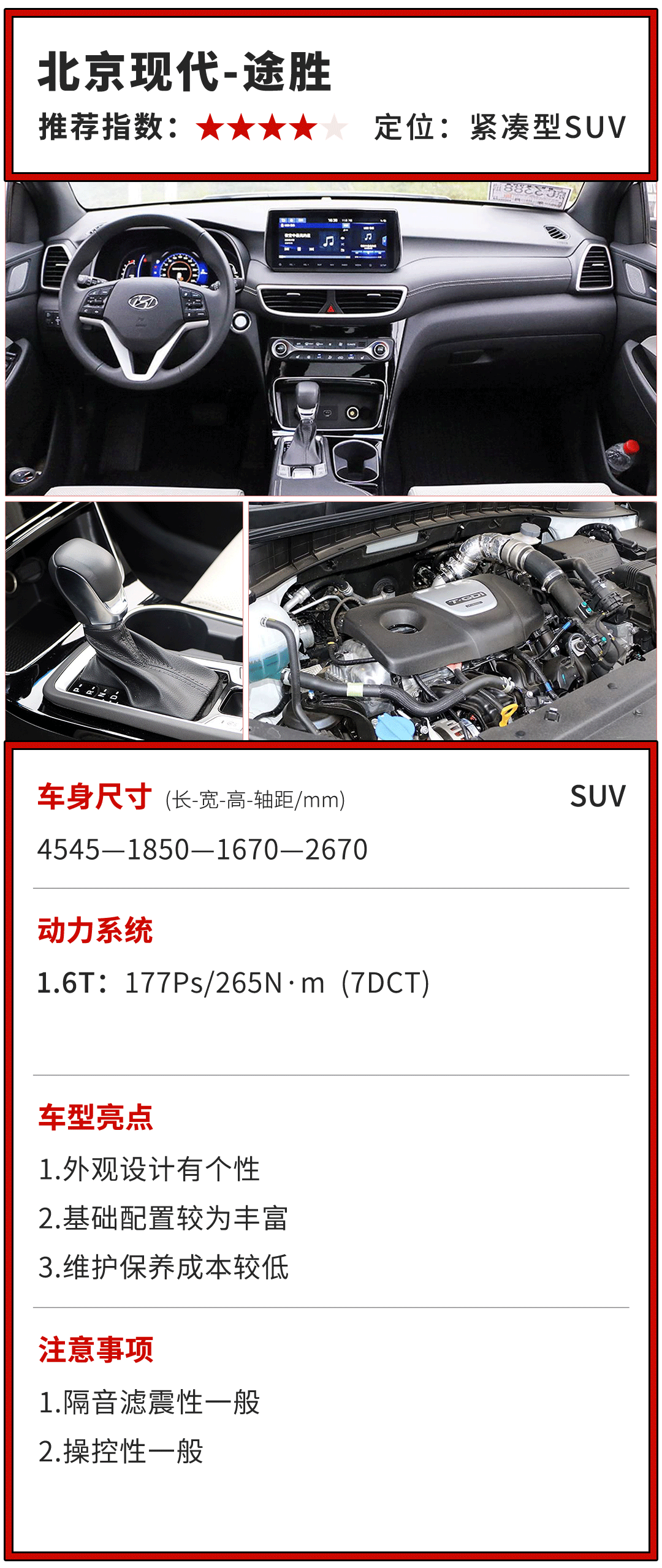 不过在今天介绍的四款车中,途胜最大的优势还是较低的维护保养成本,以及相对较强的可靠耐用性,能为车主节省下一笔不少的日常用车开支。然而有得必有舍,途胜的车厢隔音滤震性相对就很一般了,操控性也中规中矩,简单说就是底盘高级感不算强,因此途胜相对适合那些想买台车安安分分代步的消费者。