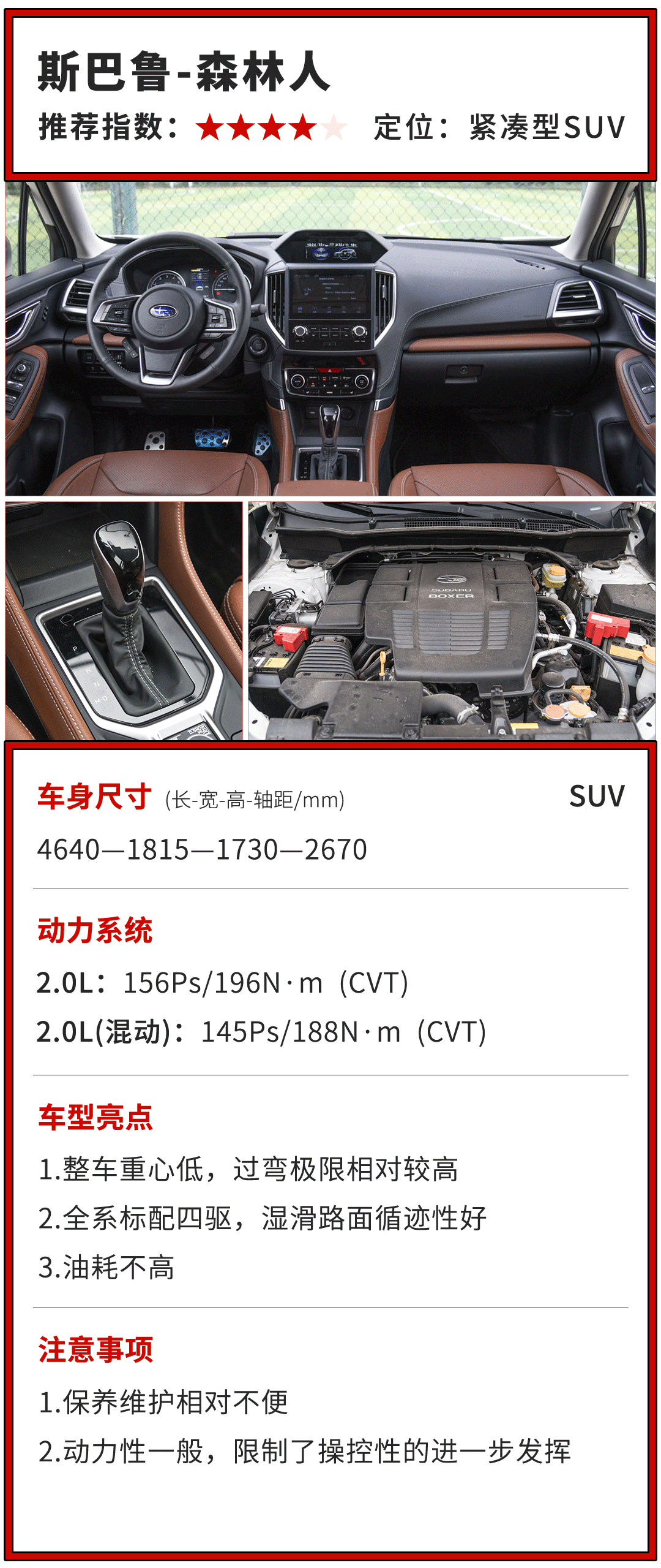但这两样技术的缺点同样显而易见,那就是由于成本高,应用不广泛,除了斯巴鲁之外就只有保时捷还在用,加上结构相对复杂,对维修技师的专业性要求高,所以不想把车越修越坏就最好到4S店保养,使得保养维护相对不便。可以说,能够选择森林人的消费者,对斯巴鲁这个品牌的认同感和信仰都是相当坚定的,而且一定是热爱研究机械的技术宅和理工男。