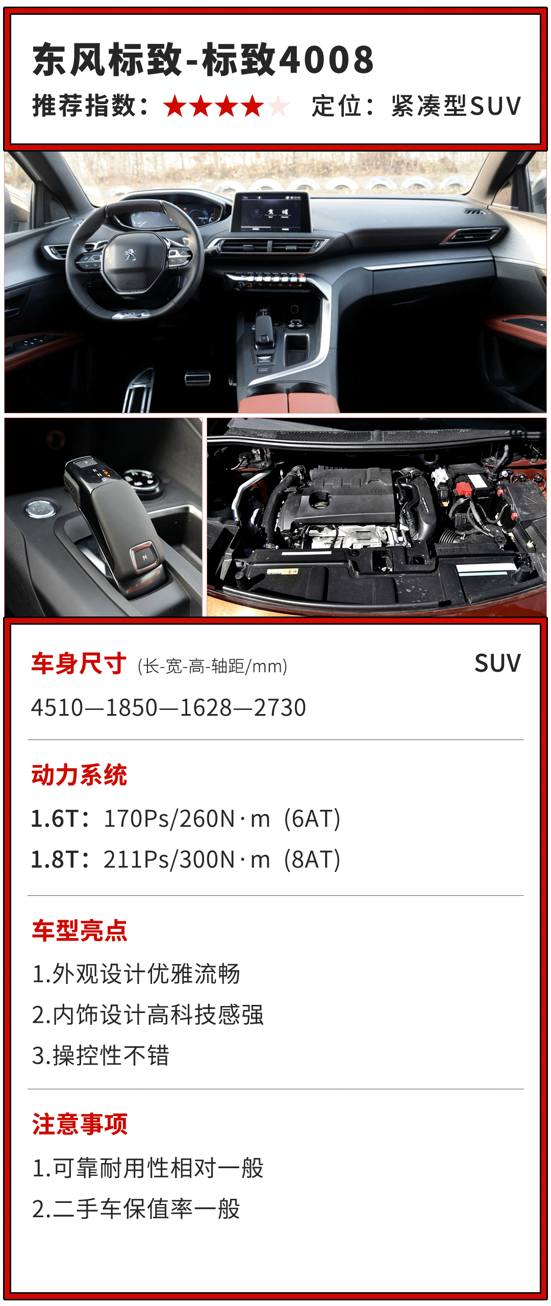 而4008的实际动态表现也不会让人失望,得益于整车视野的优良,以及较小的转弯半径,驾驶它完全没有大车感,无论是过弯、变线,还是入库、掉头,都信心感十足。但是,4008的可靠耐用性和二手车保值率就相对令人失望了,选择它的消费者,无疑都是懂得欣赏法系车优点的真爱粉。