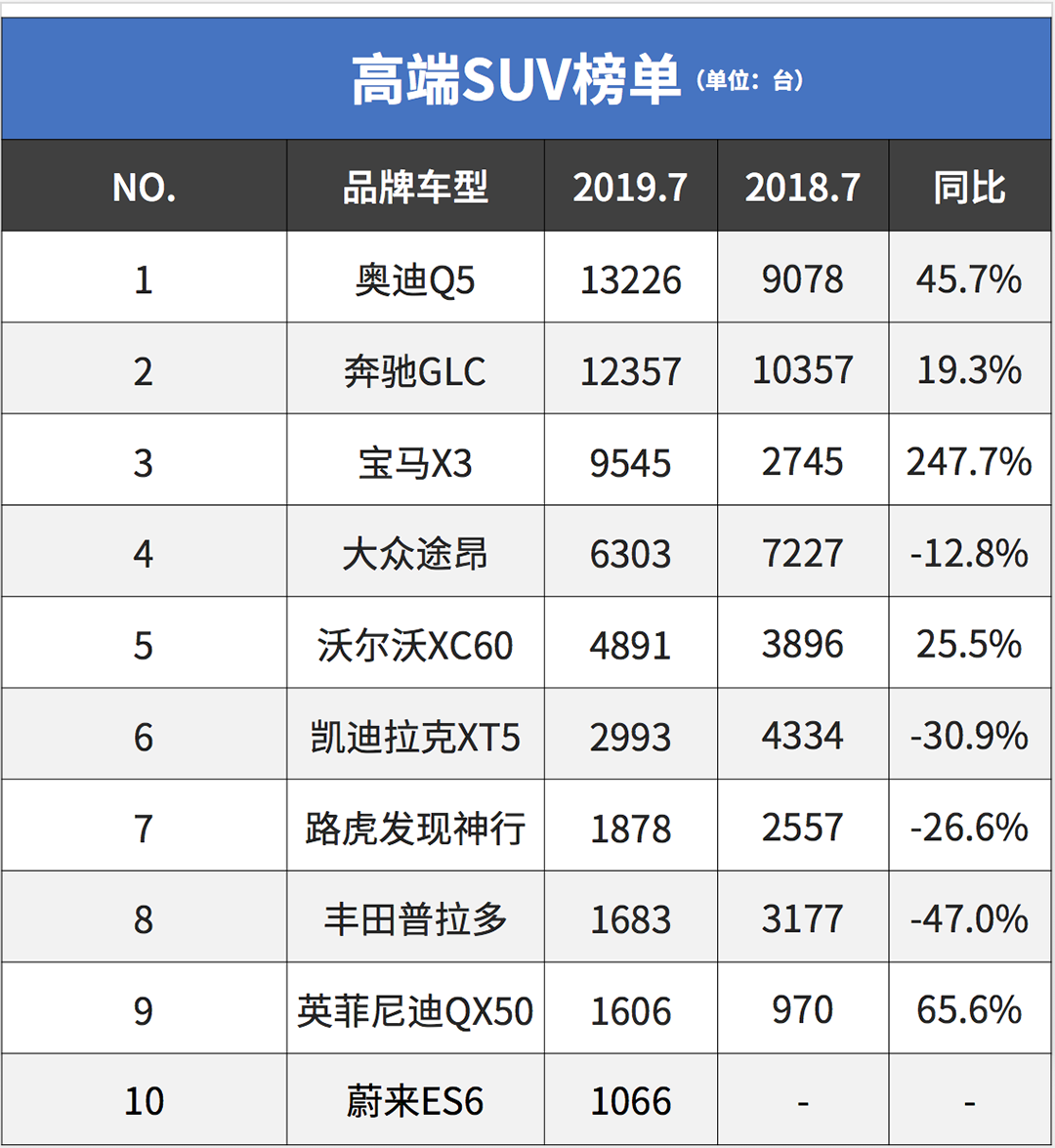 不过,奥迪的实力可不容小觑,作为一款中型豪华SUV,Q5L的表现可圈可点,已经连续两个月拿下单月销量冠军,7月份以13226台的销量继续坐在头把交椅上,较去年同比增长了45.7%。