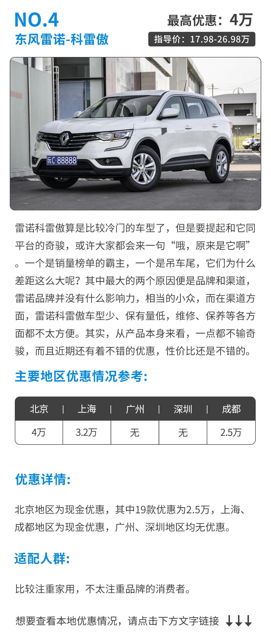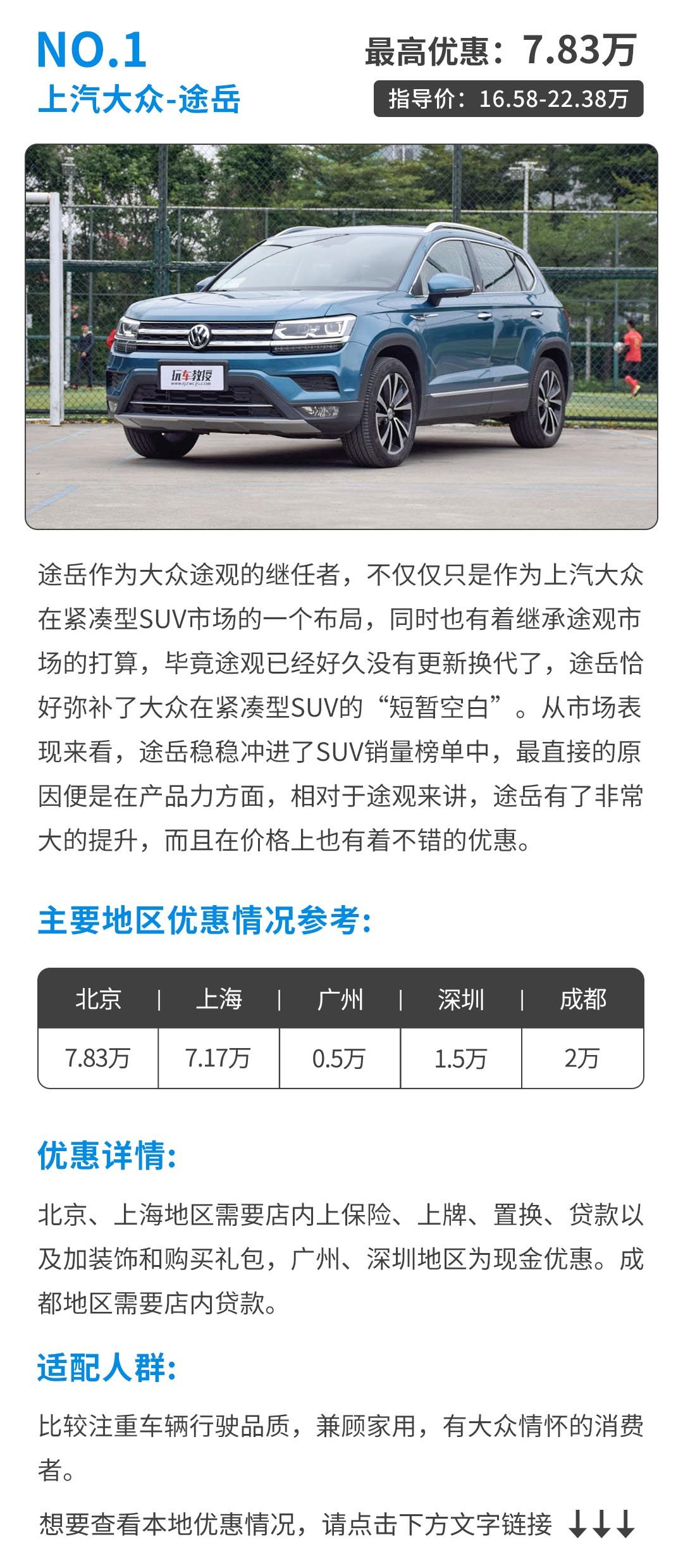 优惠并不等于说一辆车的产品力不好才会优惠,比如说途岳的优惠很大程度上是想迅速打开市场,毕竟原来就有途观的基础在这里。但是,优惠力度也在一定程度上反应了该辆车并不怎么受到欢迎,所以,SUV虽有不同程度的优惠,但也要具体情况具体分析。要买到一辆优惠还不错、性价比高的SUV还得多了解车辆本身的品质,不要一时之间因为优惠而冲动消费了。