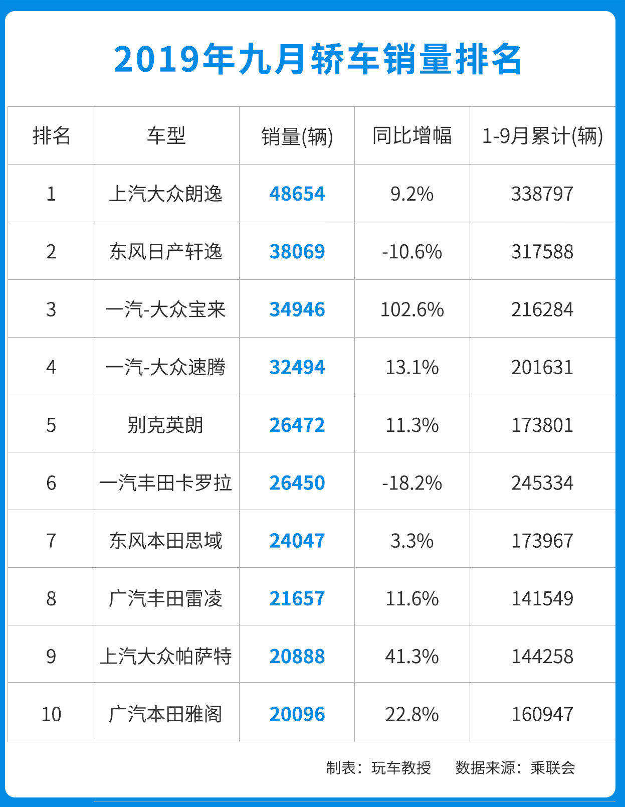 随着太阳直射点的南移,西伯利亚高空的气压逐渐升高,秋天的“脚步”悄然而至。寒冷气流正盘旋极北之地并没有南下的打算,灿烂阳光、蔚蓝天空以及微凉的秋风正是10月该有的模样。近期的车市犹如当前的季节一样,在寒冷来临之前迎来了一次不小的爆发。就在前几天,乘联会公布了9月份国内的汽车销量数据以及各类车型的销量榜单。从乘联会公布的信息上获悉,今年9月份国内狭义乘用车市场销量达178.1万辆,同比下降6.5%,环比增长14.0%,以下便是九月销量榜单: