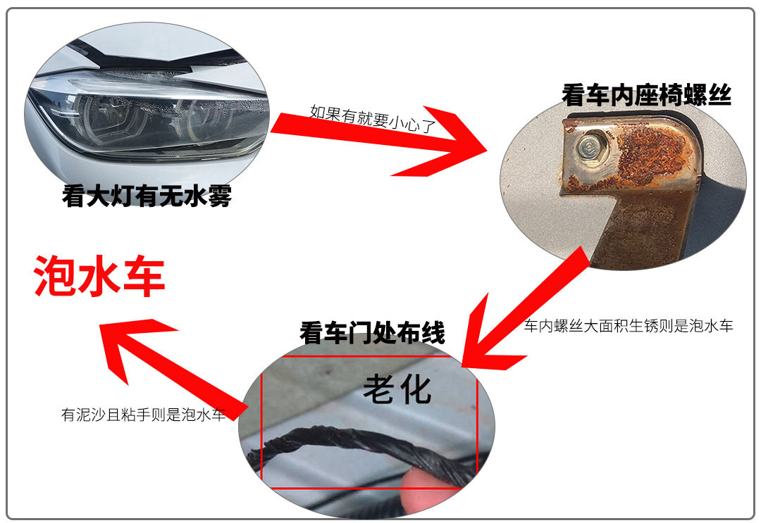 泡水车分三个等级,水深超过车轮、水深超过中控台、水深超过车顶,对于我们买车的小伙伴来讲,不管是哪个等级,都不建议入手。依照上图的步骤,看大灯、螺丝、布线等细节处,就能判别出泡水车。跟着自己的感觉走,没把握的不要下手。