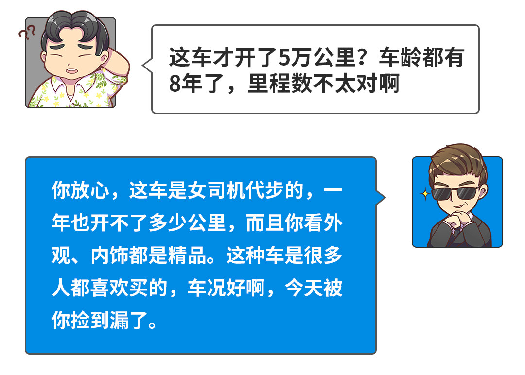 很多二手贩子喜欢说这一辆车是女司机代步车,因为女司机都比较爱护车,内饰也保养得好,公里数也少。其实大部分车都是以次充好,公里数都有调过,15万公里的车能给你调成5万,花费不到30块钱就能做到。
