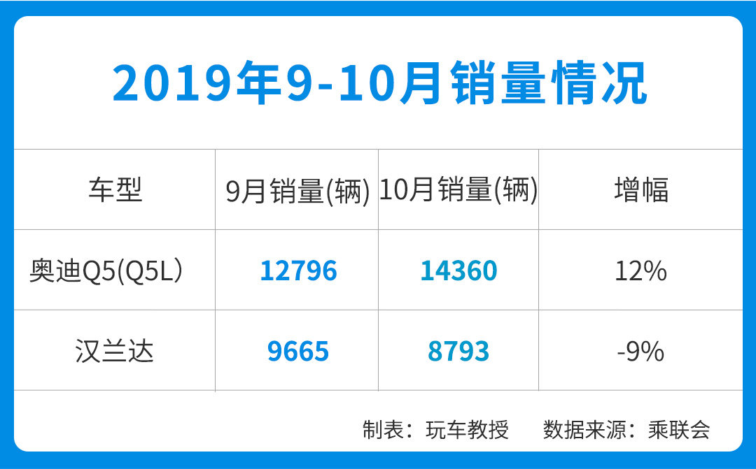目前新款的奥迪Q5L虽已上市销售,但现款的奥迪Q5在竞争力方面依然保持着与同级别相当的优势和地位。当然Q5目前已经停售,9、10月的销量也不排除包含Q5L车型的销量数据在里面。但是与同为中型SUV的汉兰达,这两个月的销量走势就与Q5相反,在Q5一个月内增量了12%的情况下,汉兰达的销量下降了9%。