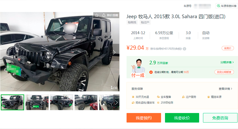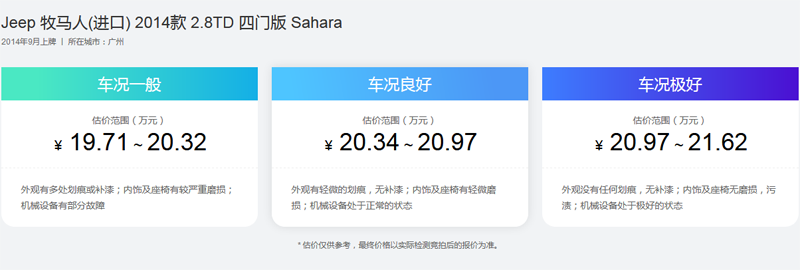 以一辆Jeep牧马人2014款 2.8TD Sahara 四门版为例,新车指导价在42.99万元,通过某二手车交易平台估价后得知车价在19.71—21.62万元之间。网上二手车交易平台的卖出价更加是去到了29万元。也就是说对于保值率越是低的车型,通过网络交易平台转卖给车主所赚的差价越多。
