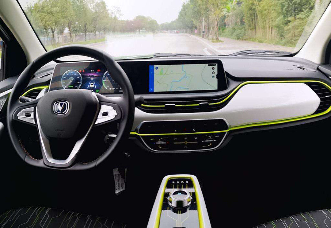 内饰方面的改变可以用翻天覆地来形容,奔奔E-Star的内饰一改老款的老土、塑料风满满的内饰。如今的奔奔E-Star使用如今流行的左右贯穿的屏幕设计,将传统的仪表盘跟中央10.25英寸的显示屏相连,全液晶仪表在同级别来说并不多见,内饰使用绿色装饰条围绕,配以白色装饰,撞色的设计正符合如今年轻人的审美,同时黄绿色也是今年的流行色。