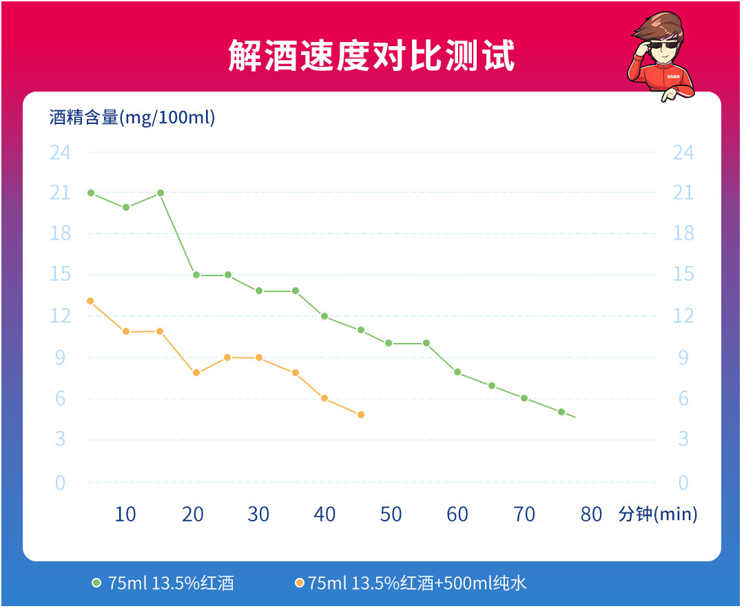 对此我们也进行了测试,先喝下75ml的红酒并且只漱口后吐掉漱口水,然后每隔5分钟进行一次呼气测试并且记录数值。等待呼气测试度数归零后再次喝下75ml的红酒,这一次一次喝下500ml的纯水,并且每隔5分钟测试一次并记录下来,对比两次测试结果的区别。