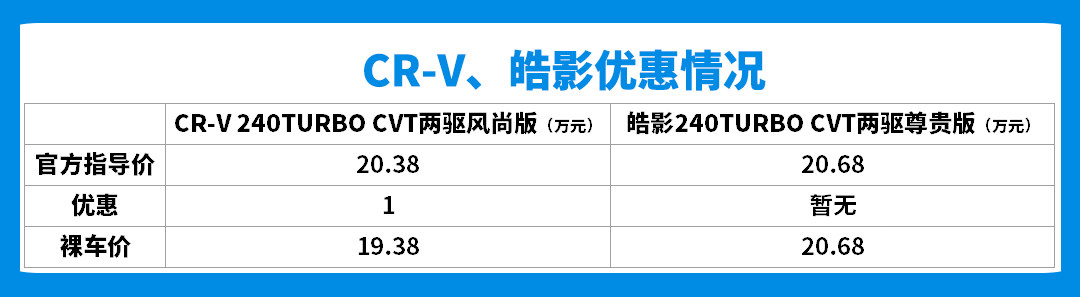以官方指导价为20.38万元的CR-V 240TURBO CVT两驱风尚版和20.68万元的皓影240TURBO CVT两驱尊贵版来看,皓影尊贵版比CR-V风尚版贵3000元,前者比后者多了Honda SENSING安全超感系统和全速自适应巡航功能,其他的配置几乎一模一样。当然因为CR-V目前有1万元左右的优惠,所以两车的裸车价相差1.3万元左右。