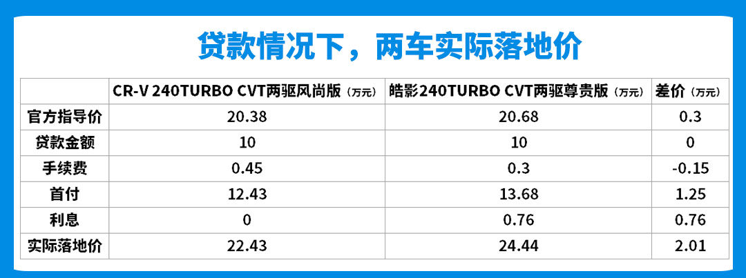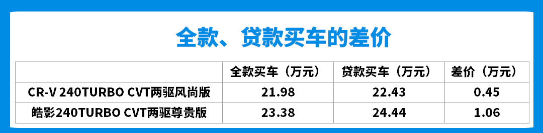 如果按贷款10万24期计算,那么CR-V 240TURBO CVT两驱风尚版和皓影240TURBO CVT两驱尊贵版的实际落地价分别为22.43万和24.44万,两者相差2.01万元。相比全款买车,贷款买车CR-V贵了0.45万,皓影贵了1.06万。