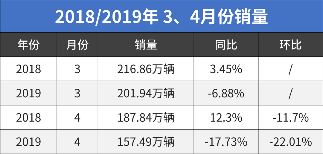 照理来说,官降后,汽车的销量应该迎来一波增长。但是4月份的销量出来后却迎来了一波扎扎实实的打脸。通过表格不难发现,4月份的销量比3月份稍低是一个正常的周期波动现象。不过,2018年4月份环比(对比上个月)下降11.7%,到了2019年4月份的销量环比下降了22.07%。官降后,不仅没有将环比下跌止住,还扩大了环比下降的幅度。
