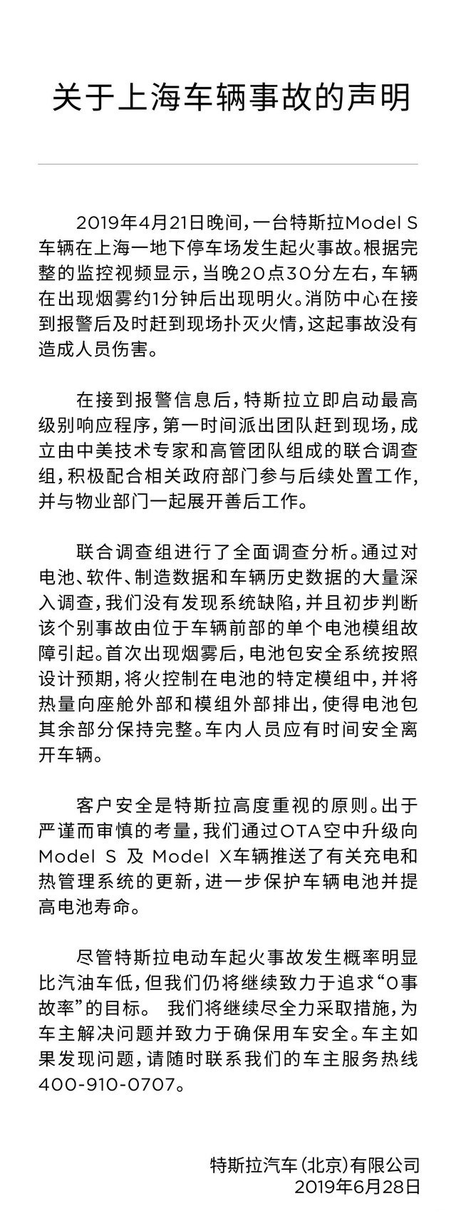 在6月28日特斯拉发布的声明指出“通过对电池、软件、制造数据和车辆历史数据的大量深入调查,我们没有发现系统缺陷,并且初步判断该个别事故由位于车辆前部的单个电池模组故障引起”。接着,特斯拉向model X和model S 通过OTA升级了充电和热管理系统保护车辆并提高电池的寿命。