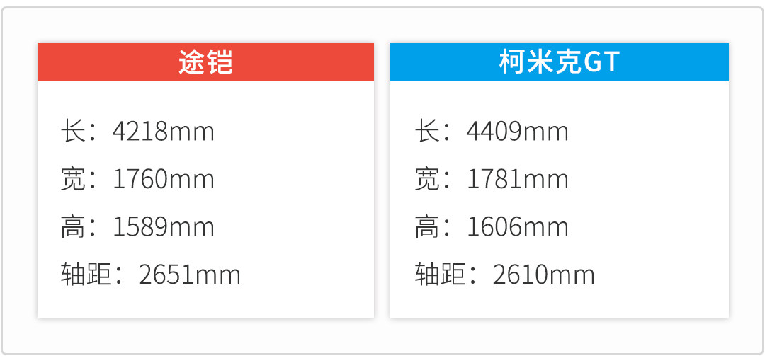 在车身尺寸方面,从数据上来看其实柯米克GT还是更具优势的,在长宽高方面都超越了途铠,可见这虽然是一台以运动为主但却不失实用的车型,还是很清楚的知道作为SUV在空间上的重要性。而途铠更多的则是吧空间放在了后排上,虽然会带给更好的乘坐空间,但是却会丧失一定的储物空间,这一方面则显得不够柯米克GT来得平均了。