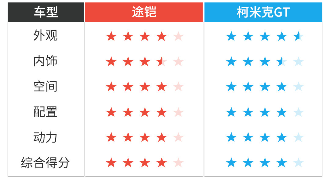 总的来看其实两款车型都很棒,自身的优点都非常突出,至于该如果选择其实更多的看你个人喜好了,如果你喜欢时尚的则是途铠,如果喜欢年轻运动的那柯米克GT自然会是一个更好的选择。
