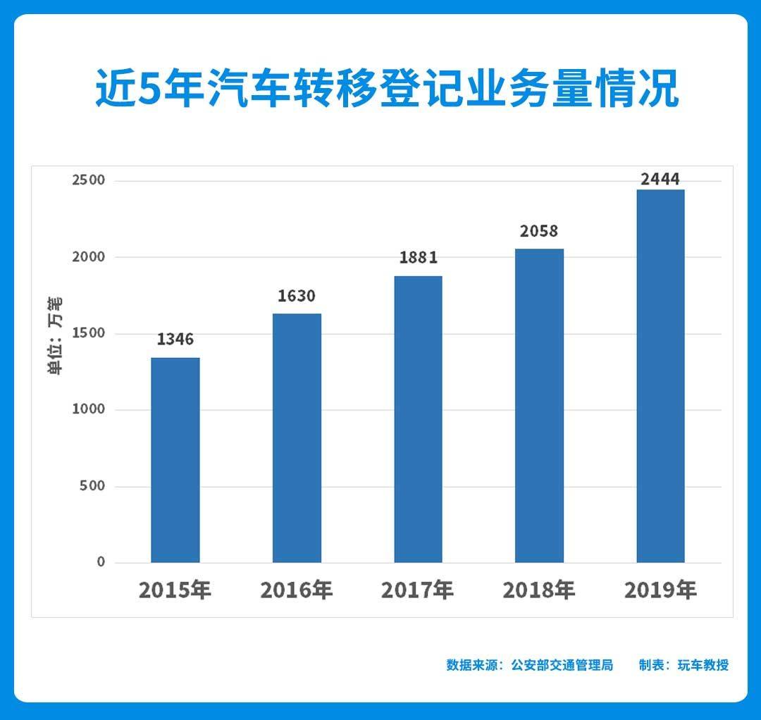 根据公安部交通管理局发布的最新数据显示,汽车转移登记业务量从2015年的1346万笔增加到2019年的2444万笔,短短五年增长了近一倍,反映出二手车市场日益活跃。