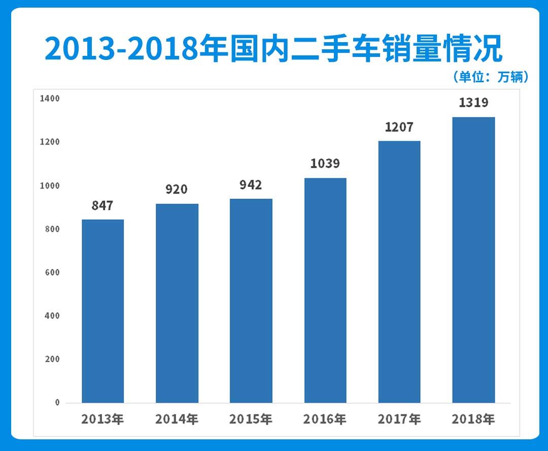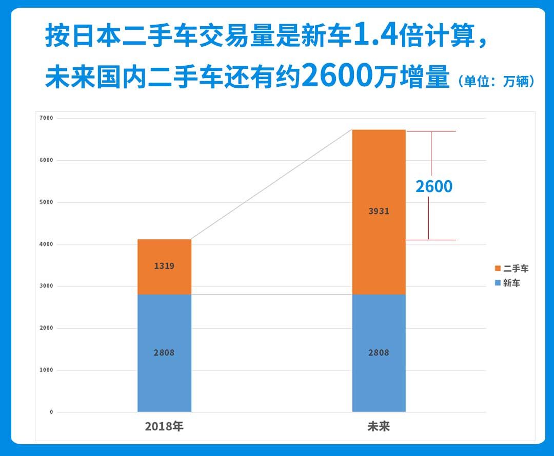 而在国内,2018年国内汽车销量为2808万辆,同期的二手车销量为1319万辆,二手车销量仅占新车的46.9%,这一比例与美国和日本相比还有很大差距。如果以2018年的新车销量为基数,按照日本二手车是新车的1.4倍来算,那么国内二手车市场还有近2600万的增量。